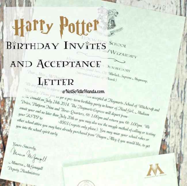 3. Harry Potter Birthday Invitation and Acceptance Letter ~ Need a cute invitation for your next Harry Potter party? Come see how to make ones to look just like the acceptance letter from the books…..as well as the acceptance letters themselves! {{super fun!}}