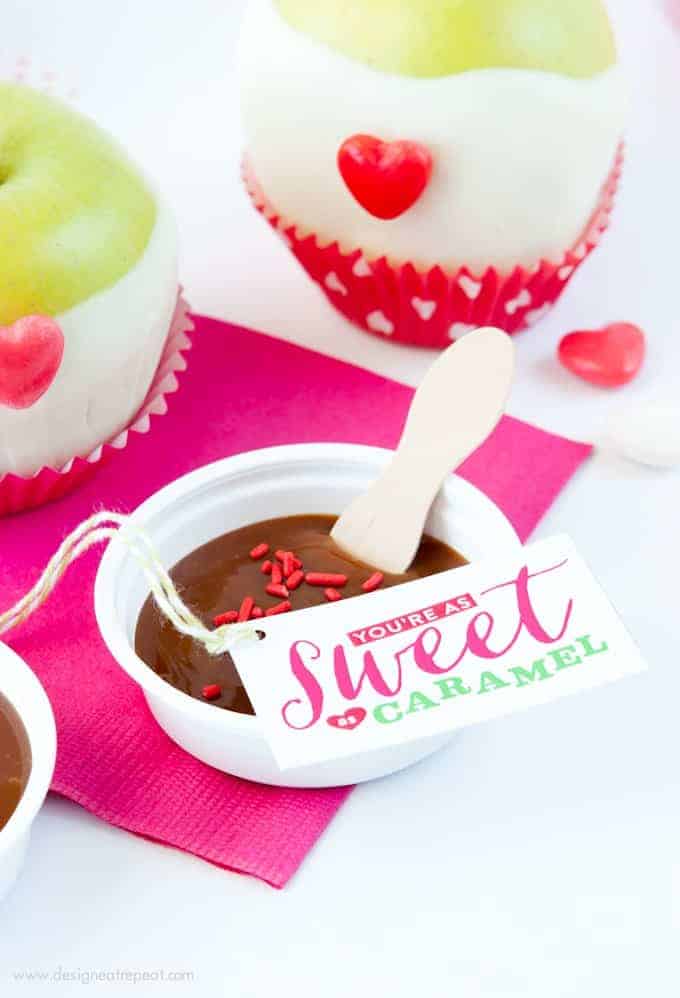 4. Valentine’s Day Caramel Apple Kit ~ Caramel apples are a fun and easy gift idea. Apples are dipped in melted almond bark and then packaged up for later dipping in the individual sized caramel dips.