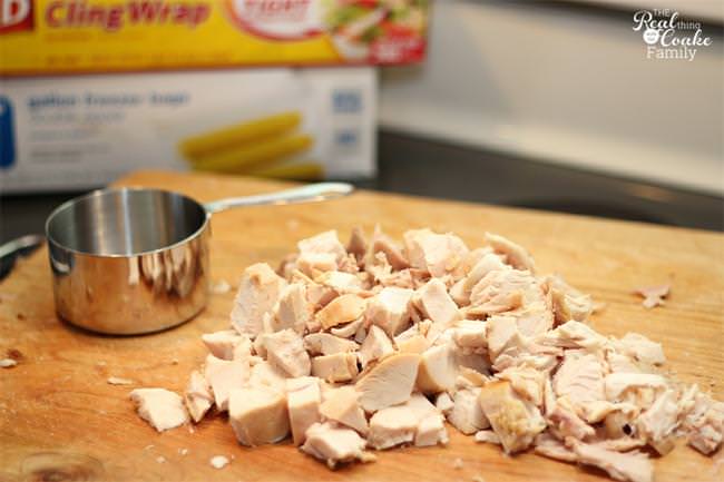 Cut up all the chicken off a store bought rotisserie chicken. Cut up into small pieces (the size you want in a recipe).