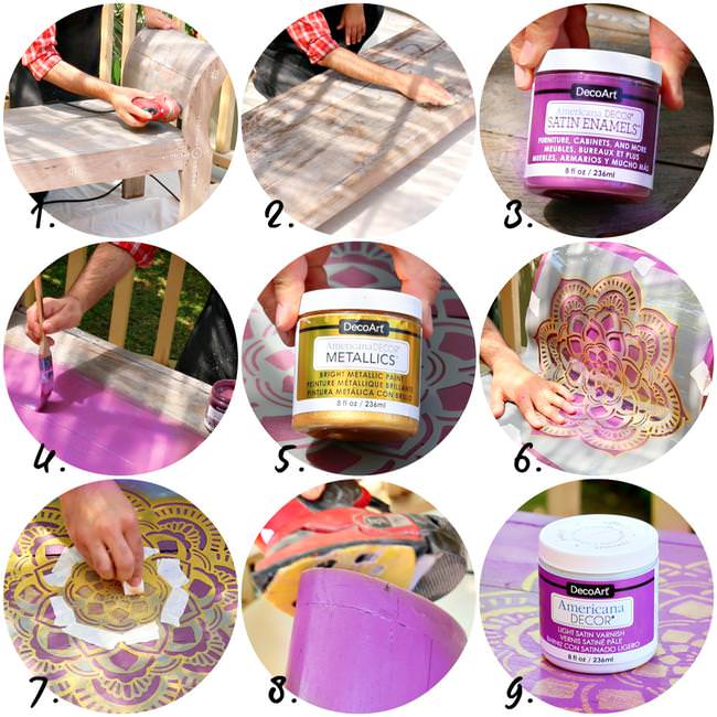 5. & 6. Stencil your design in the center and on the edges (or arms) of your bench with Americana Decor Metallics Antique Brass