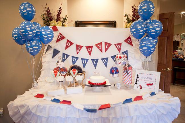 Paper Plane Garland. I folded paper plans from red, white, and blue paper and strung them on twine to create a fun garland which I used on this dessert table as well as one of the game stations. I was SO easy and brought the theme throughout the house.