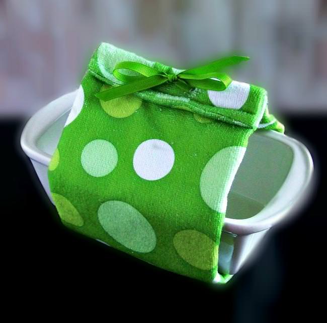 A pretty Insulated Loaf Pan Carrier made with a kitchen towel to keep your loafs warmer, longer and so you don’t have to handle a hot dish. Great to use for taking to parties or sit on your counter to keep from burning your counter top.