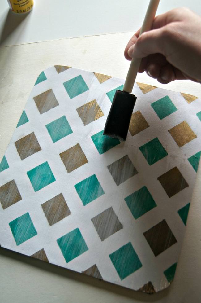 Using my gold and teal Sharpie, I colored each diamond with alternating colors. I then peeled off the washi tape and was left with a pretty pattern. I used Mod Podge and put some on both the mousepad and the bottom of the paper.