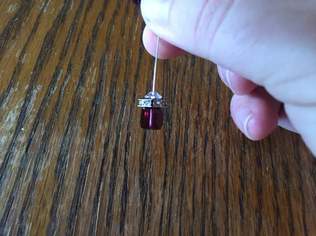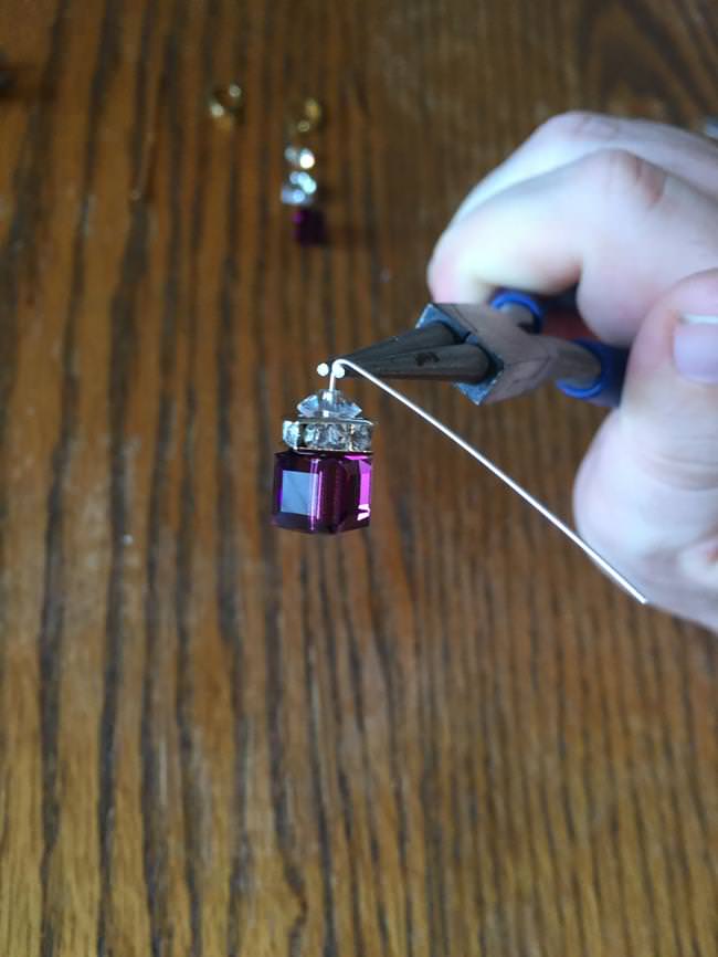You’ll need a very simple list of materials to create these earrings: round nose pliers, chain nose pliers, bent nose pliers, wire cutters, two 2 inch 24 gauge silver plated headpins, two 8 by 8 mm amethyst Swarovski cubes, two 8 by 8 mm silver plated squaredelles with clear crystals, two 6 mm clear Swarovski spacers, and 2 silver plated leverbacks.