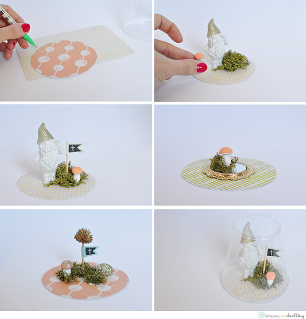 Once your items are dry, hot glue them to the scrapbook paper and then glue the plastic cup down.