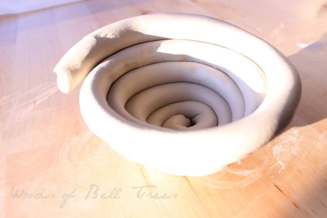 Roll out a long snake of clay a little smaller than the diameter of a dime and coil up into a bowl.