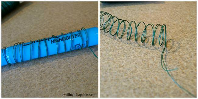 I used green wire and wrapped it around a pen to get a coil, and then wrapped that around the stem. Voila! A basket pumpkin!