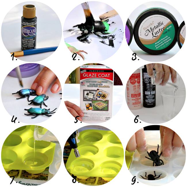 Paint plastic bugs to look real (with DecoArt Metallic Lustres) and then trap them in resin for a creepy cool paperweight. Great project to do with the kids!