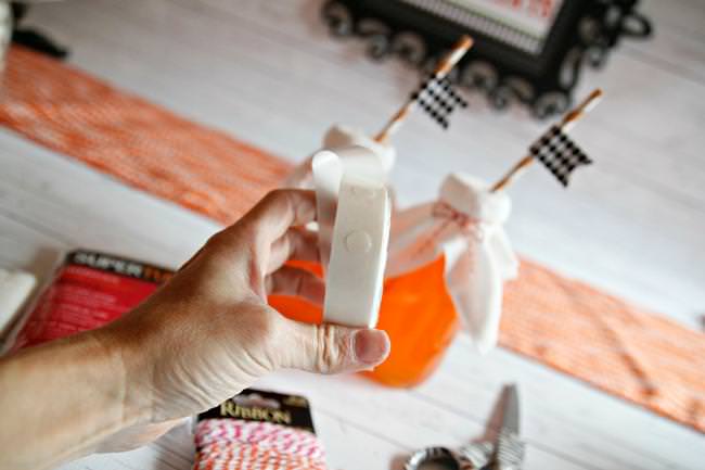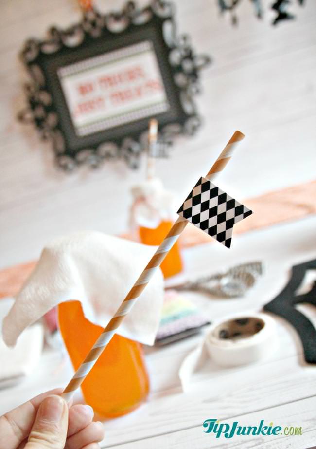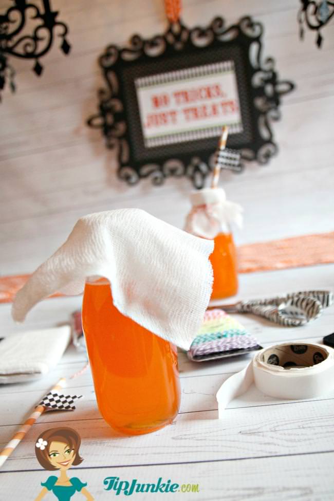 They are so easy to make! I got the glass jars from the $1 Spot at Target, used cheese cloth orange bakers twine, party straws, and my free printable paper flags.