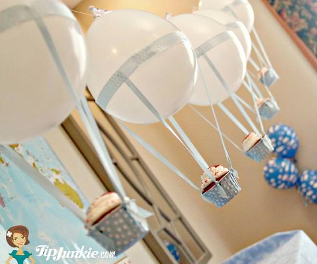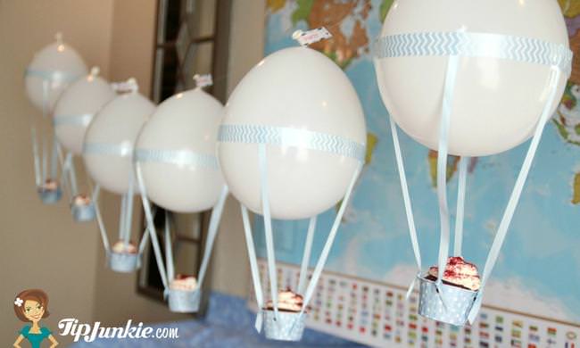 Give your travel birthday party the WOW factor with these Hot Air Balloon cupcakes made into a garland or banner. You can put anything inside the muffin cups like candy, muffins, or cupcakes!