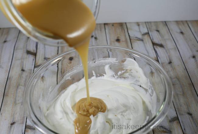 Place 16 oz of whipped topping in a large mixing bowl. Fold in Dulce de Leche.