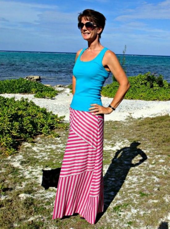 This maxi skirt has 3 tiers and the option to have the bottom tier with horizontal or vertical stripes. Comfy elastic waist and plenty of volume for swishing about. Keep it long for an elegant look. It looks good in wide or narrow stripes but of course, you don’t have to use a stripe – you can use any fabric. Recommended for knit fabrics only Enjoy your skirt and have a great summer!