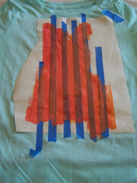 Use the masking/blue tape to create stripes on the bunny (leave the freezer paper on the shirt). Paint the bright coral in the stripes.