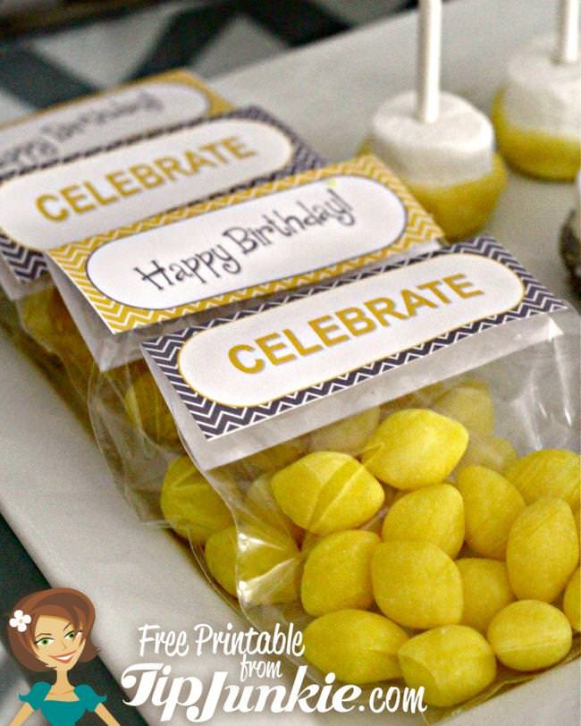 Simply print out these yellow and grey treat bag toppers pre-printed with ‘Happy Birthday’ and ‘Celebrate’. Yep, I’ve taken the work out of labeling your treats for you! {high fives} You can use these treat bag toppers for birthday parties, events and special occasions for your party favors.