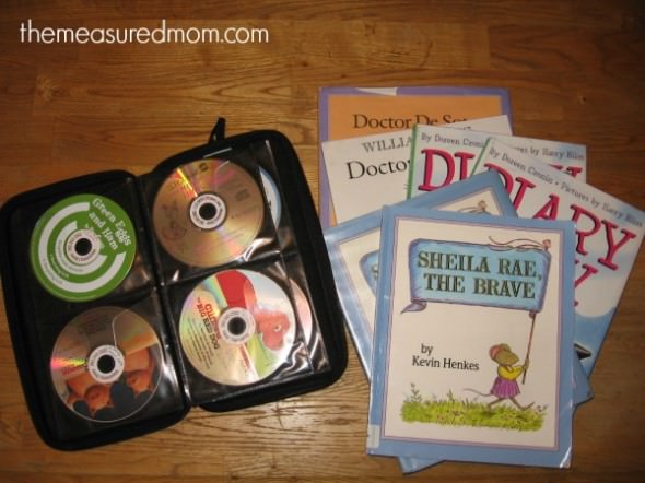 If you have time, get to your library a couple weeks before your trip and gather some new or favorite books. Get accompanying CD recordings and save them in a CD case. Pull these out when your kids get bored and you’re hoarse!