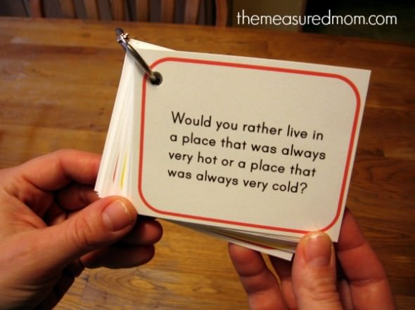 Without a doubt, these fun “would you rather” conversation starters were the biggest hit of our trip! “Would you rather have bright blue hair or bright blue feet?” Print the 48 free cards or a single page with all the questions for easy reference. Have fun getting to know your family a little better!