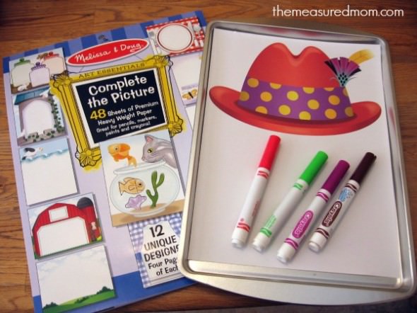 Purchase some inexpensive magnetic baking sheets (ours were a dollar each at Walmart). Then get some magnet strips and hot glue them to markers or crayons. Buy some inexpensive drawing pads (ours were from the dollar bin at Target). Now you have a simple lap board for your trip. Your kids can draw and create without losing their crayons every five minutes!
