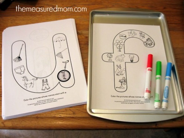 My preschoolers love to color, so I packed these beginning sounds coloring pages to give them a little alphabet review at the same time. (Yup, you can get all 26 letters free!)