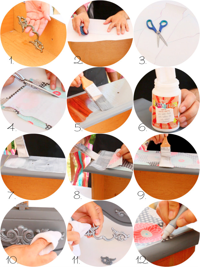 6. – 8. Apply Americana Decoupage to the face of the drawer (where the fabric will be placed) and apply the fabric to the drawer.
