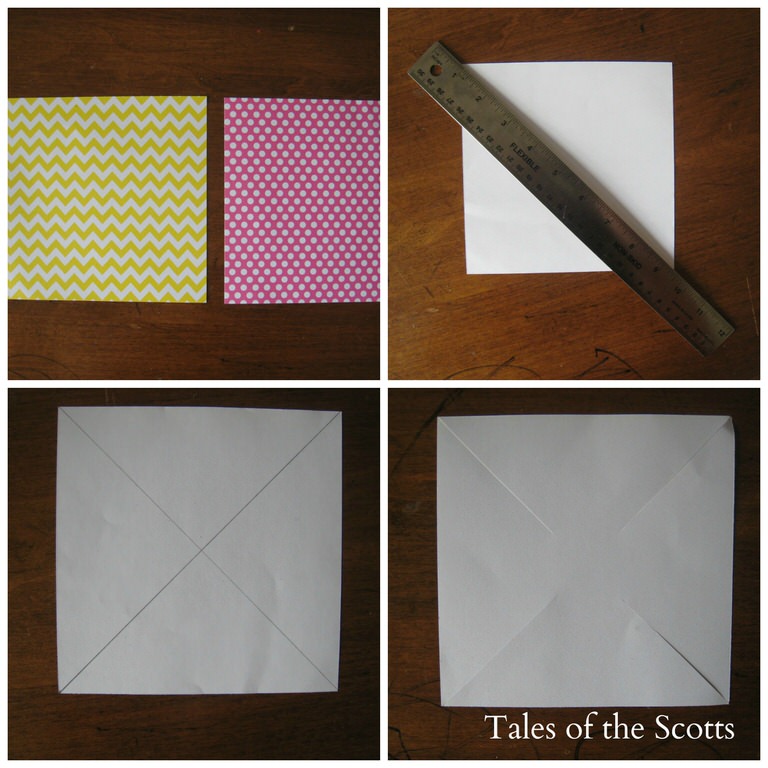 Take some scrapbook paper. I used two pieces because I didn’t want the white side to show through. Some papers are double sided so those would work perfectly. I cut them to various sizes. 4×4, 3×3 and 2×2 were the sizes I used. Take a ruler and draw a line from one corner to the opposite corner on the back side of the paper. Do the same to the other two corners. Then cut up toward the middle leaving about 1/2 inch uncut.