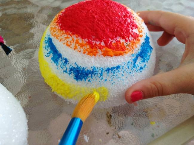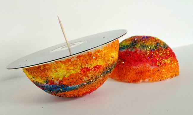 So if you ever find yourself needing to make an intergalactic project, all you need is a 4-inch styrofoam ball, some paint (we used Crayola), a toothpick, a CD or DVD, and some hot glue. Oh, and if you have a little diva…might want to throw in some glitter.