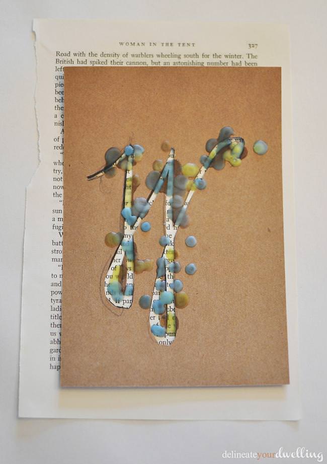 Place your card stock letter onto of a book sheet. CAREFULLY CAREFULLY hold a candle over the letter and a small flame nearby so as to warm candle and drip wax. (please be careful on this step)
