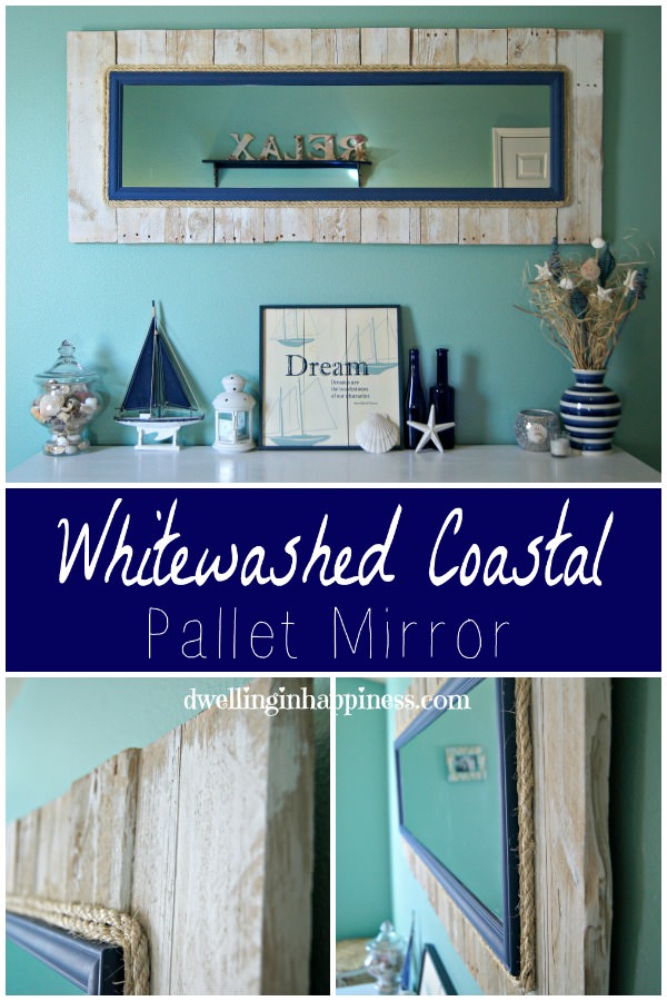 My first pallet project is complete! I had a tall and skinny mirror in my closet that needed something added to it. So, we decided to use pallets to make the mirror more beachy to go in our coastal themed bedroom! You could also leave it standing upright against a wall, but we used it horizontally on the wall.