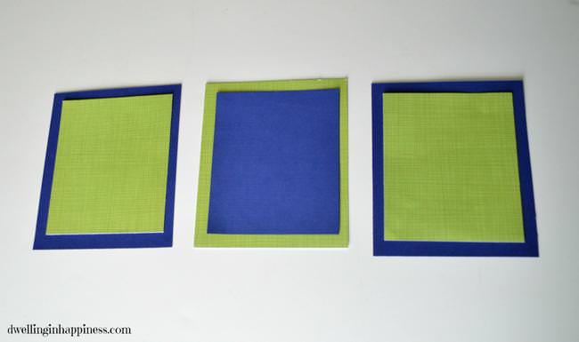 Cut 3 pieces of cardstock (2 same color, 1 different) which the animals will be glued to, and then cut 3 more (opposite colors) to act as the “border” behind the paper.
